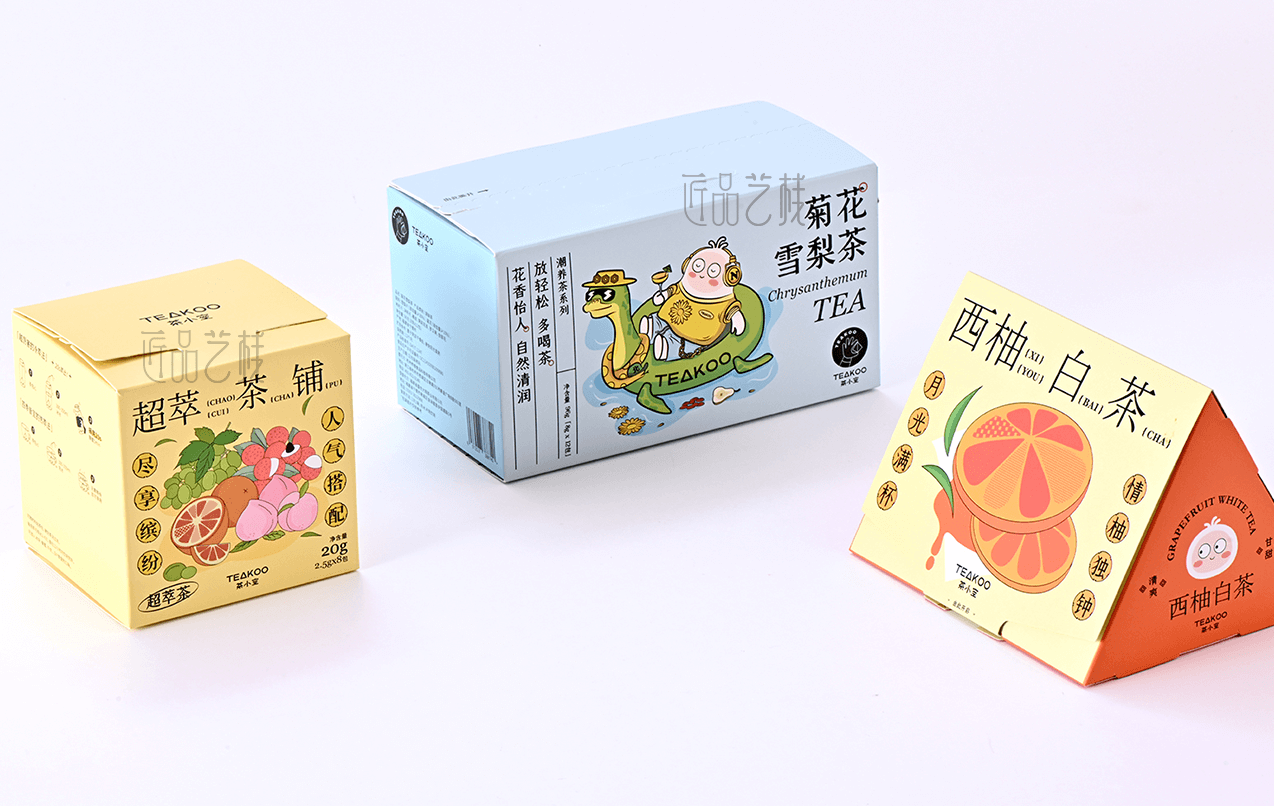 茶小寶茶飲品牌,突出健康茶飲對都市時尚人群的溫暖與陪伴,在該品牌茶飲包裝盒定制中,采用新穎的包裝盒結構方式,結合優質白卡紙張與海德堡設備精印,打造網紅時尚茶飲又一新潮品牌,深受新型消費人群喜愛。