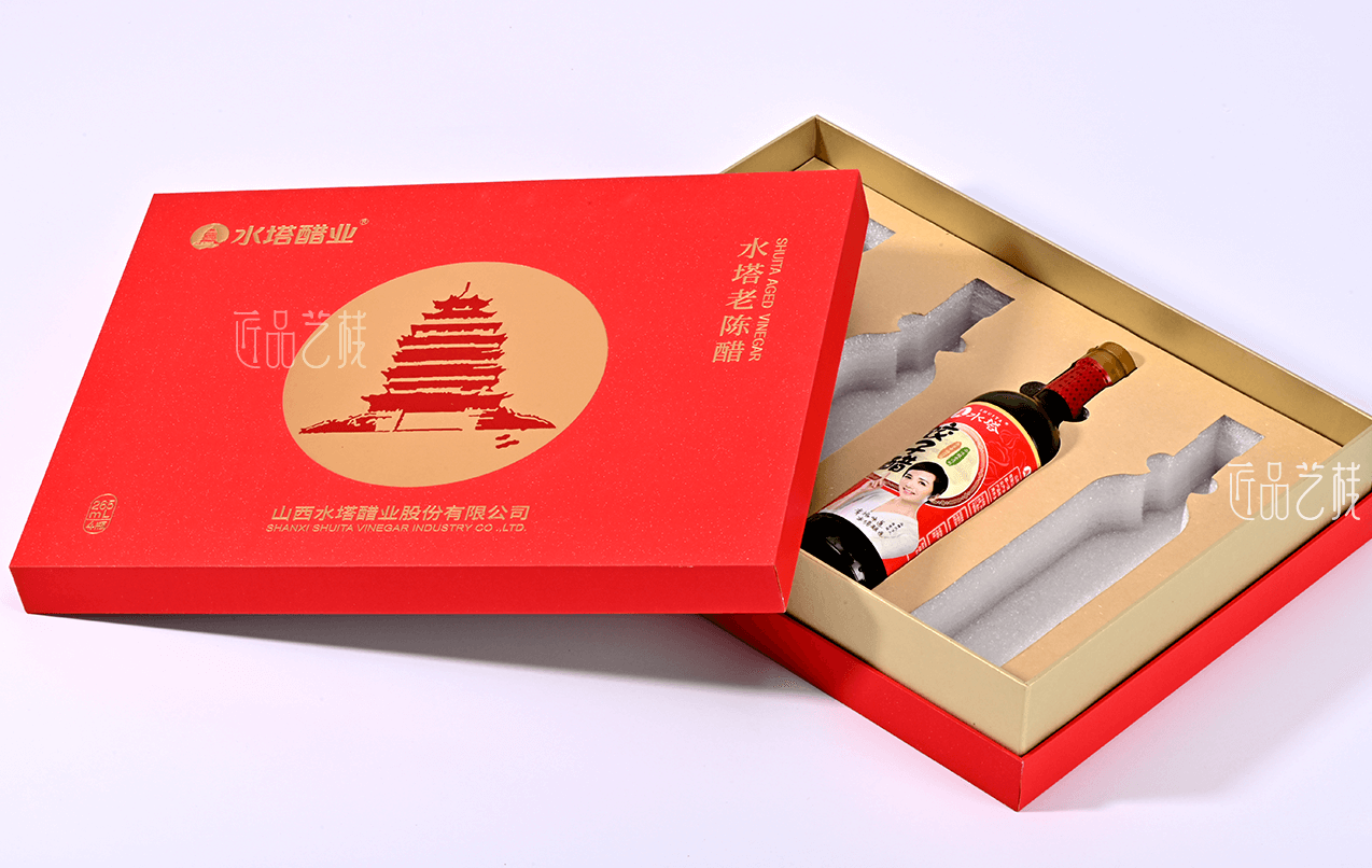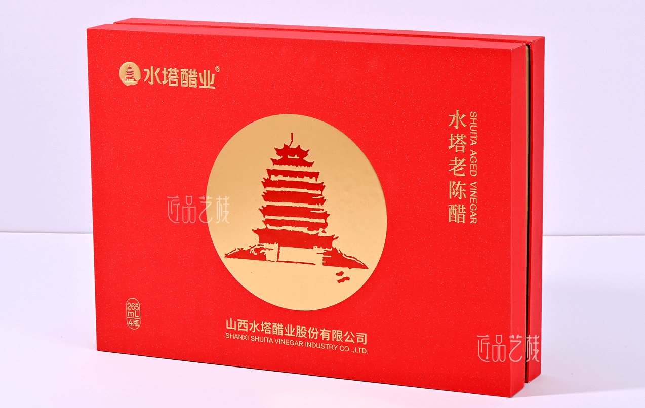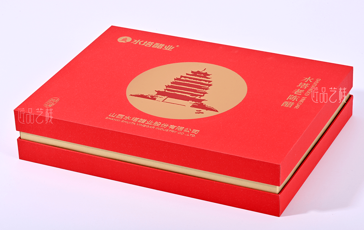 水塔醋業位于“中國醋都”山西清徐縣,是國家八部委命名的全國農業產業化重點龍頭企業,在其包裝盒印刷定制中,采用天地蓋禮盒套裝結構,在中國紅色的面紙上精制細砂與浮雕燙金工藝,搭配枊釘扣手提袋工藝,使整個包裝禮盒呈現出高端、精致的輕奢尊貴體驗感。