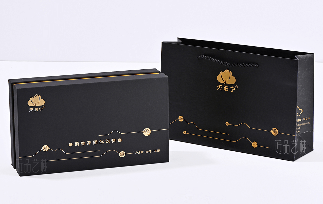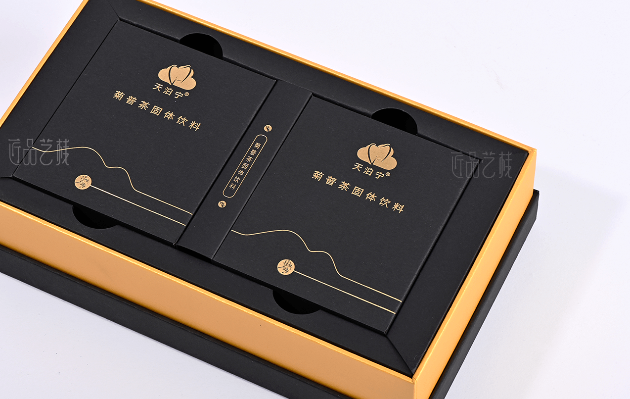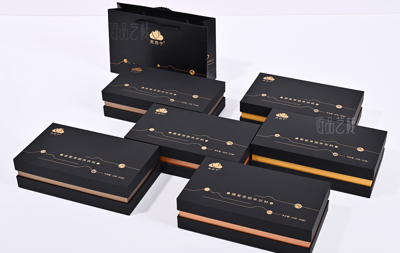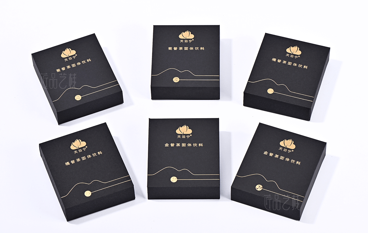 匠品藝棧在與天泊寧茯苓健康茶粉系列包裝設計印刷時,根據其產品特點,采用統一的a級黑卡為面紙,并結合其羅漢果、菊花、金橘等產品分類,采用不同特種紙張作圍條為區分,既很好統一其系列產品的品牌形象,又使不同產品之間得到區分體現,打造“普洱茶中的黃金”,適合愛健康、愛喝茶小伙伴們。