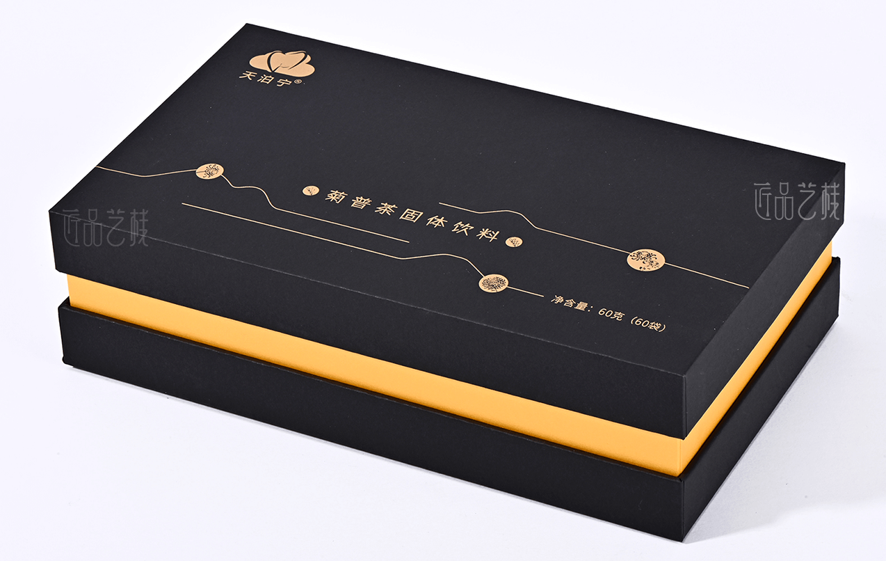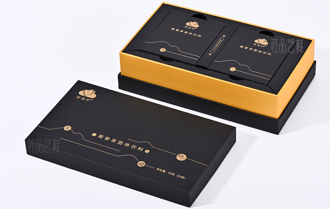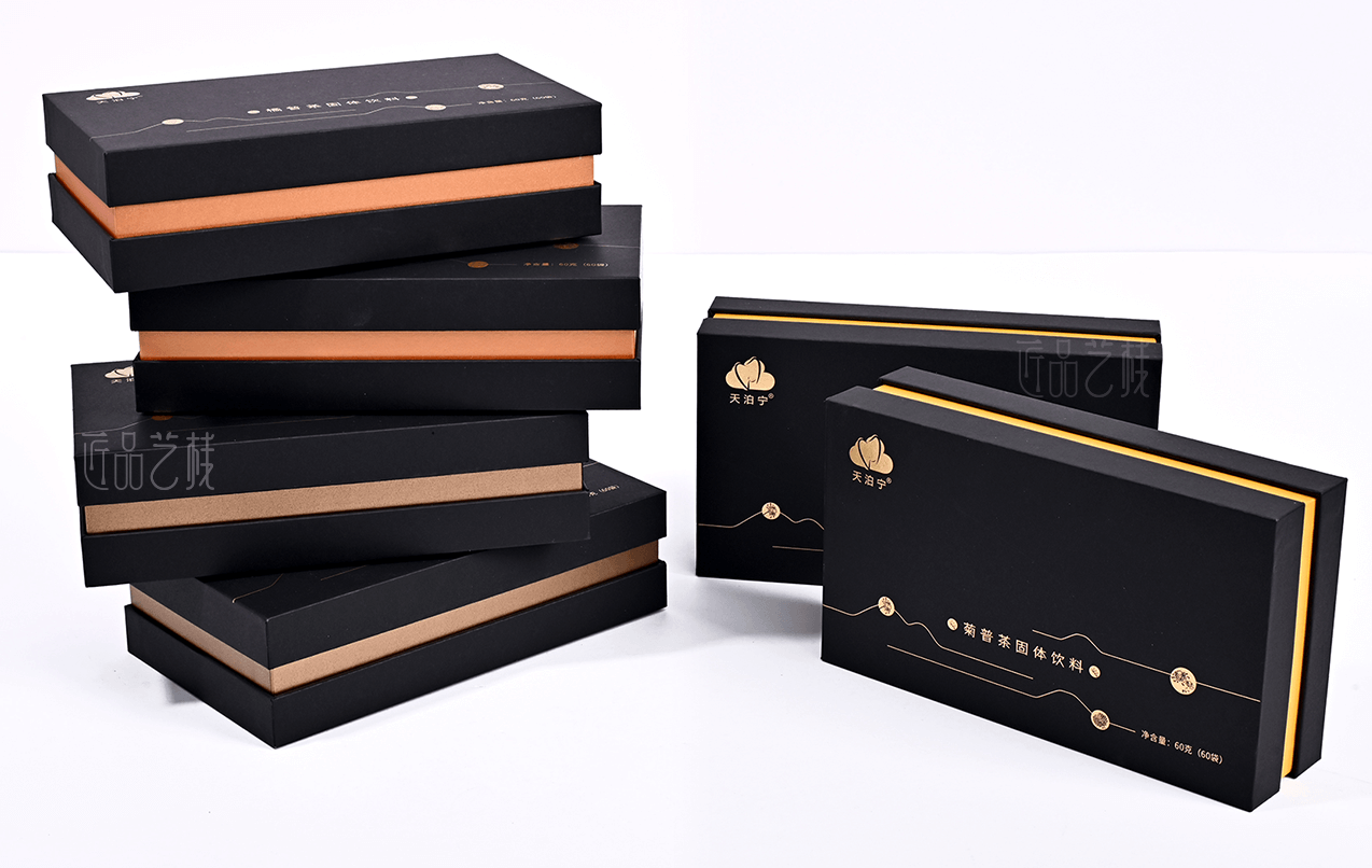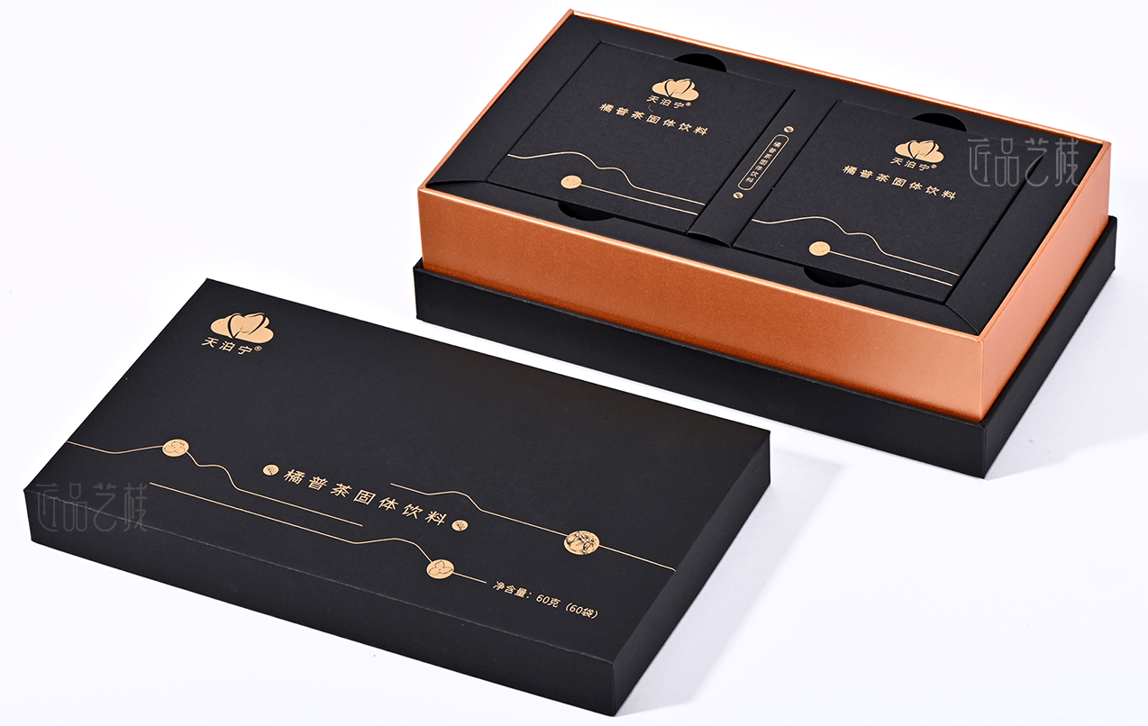 匠品藝棧在與天泊寧茯苓健康茶粉系列包裝設計印刷時,根據其產品特點,采用統一的a級黑卡為面紙,并結合其羅漢果、菊花、金橘等產品分類,采用不同特種紙張作圍條為區分,既很好統一其系列產品的品牌形象,又使不同產品之間得到區分體現,打造“普洱茶中的黃金”,適合愛健康、愛喝茶小伙伴們。