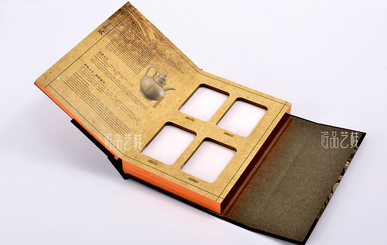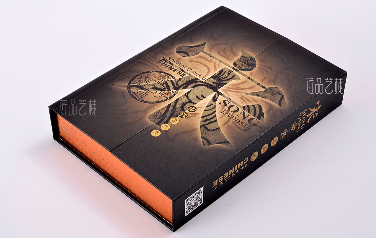 古錢真品集包裝盒套裝定制,是一款專為古錢幣收藏而定制的包裝盒,采用蝴蝶活頁精裝的創意結構,以中國古典元素結合雙開門的形式,以及金邊燙印等工藝,使整個包裝盒呈現出古典、奢華和濃濃的歷史感,體現出所收藏古幣的高端品質感和文化價值。