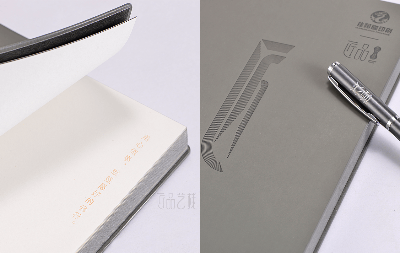 匠品藝棧文創筆記本,是由佳潤隆包裝印刷公司自主設計、印刷、裝訂定制的簡約創意筆記本,精選高端皮質、筆記本專用紙張,并搭配銀邊滾燙的工藝精制而成,配置禮盒套裝,以此起到禮品和宣傳的雙重作用,同時更進一步沉淀公司為客戶提供文創筆記本生產定制的經驗和能力。