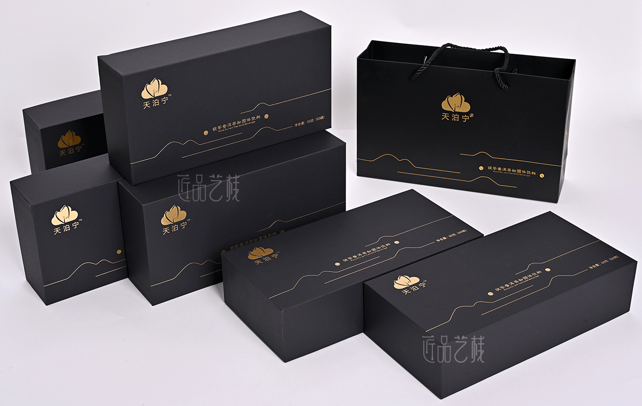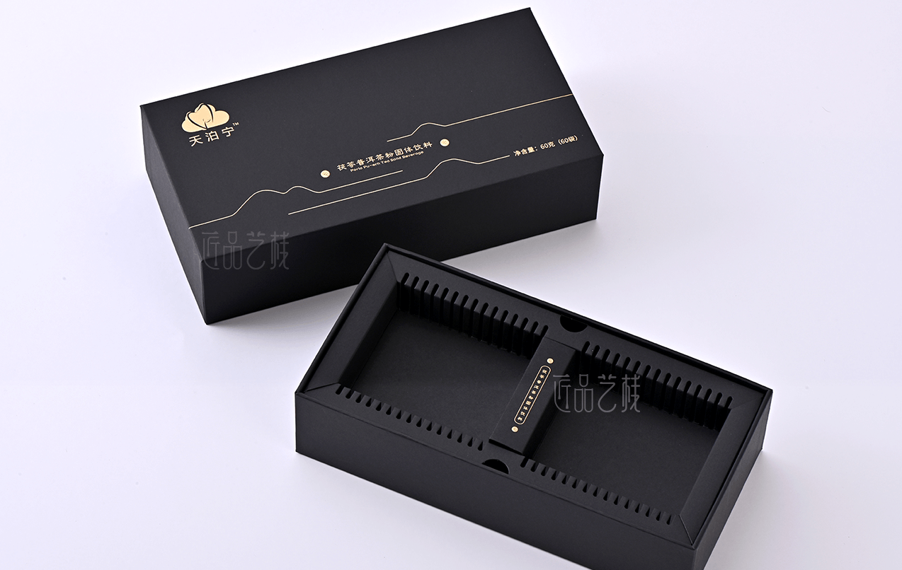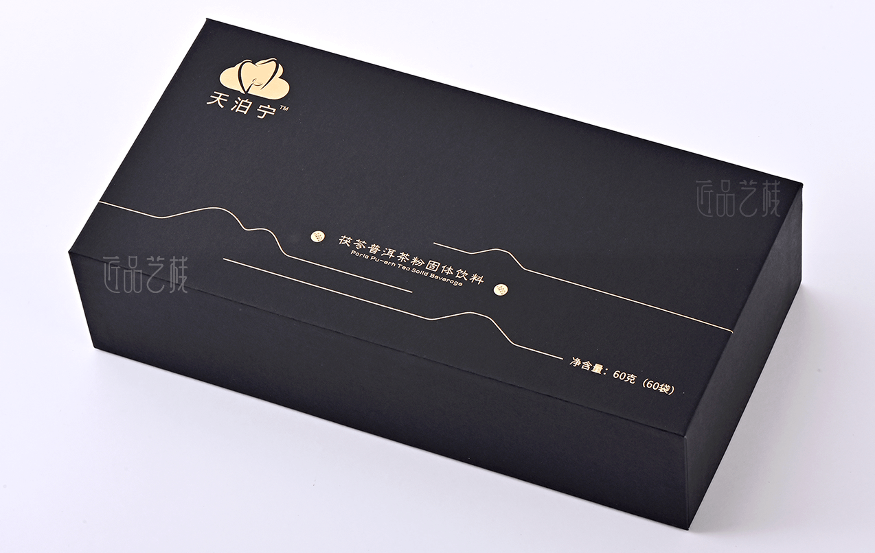 深圳繪云醫藥生物科技,是一家集開發、技術創新和方案解決的大健康領域優秀企業,旗下天泊寧品牌亦是深圳佳潤隆包裝印刷&匠品藝棧長期合作品牌之一,在本固體飲料產品包裝盒定制中,我們采用黑色卡紙為主體的形式,創意設計主題元素和包裝內托,提供從包裝方案設計到印刷制作等整體服務,為天泊寧品牌精心打造又一款優秀產品包裝盒,大力提升產品的溢價能力和品牌氣質。