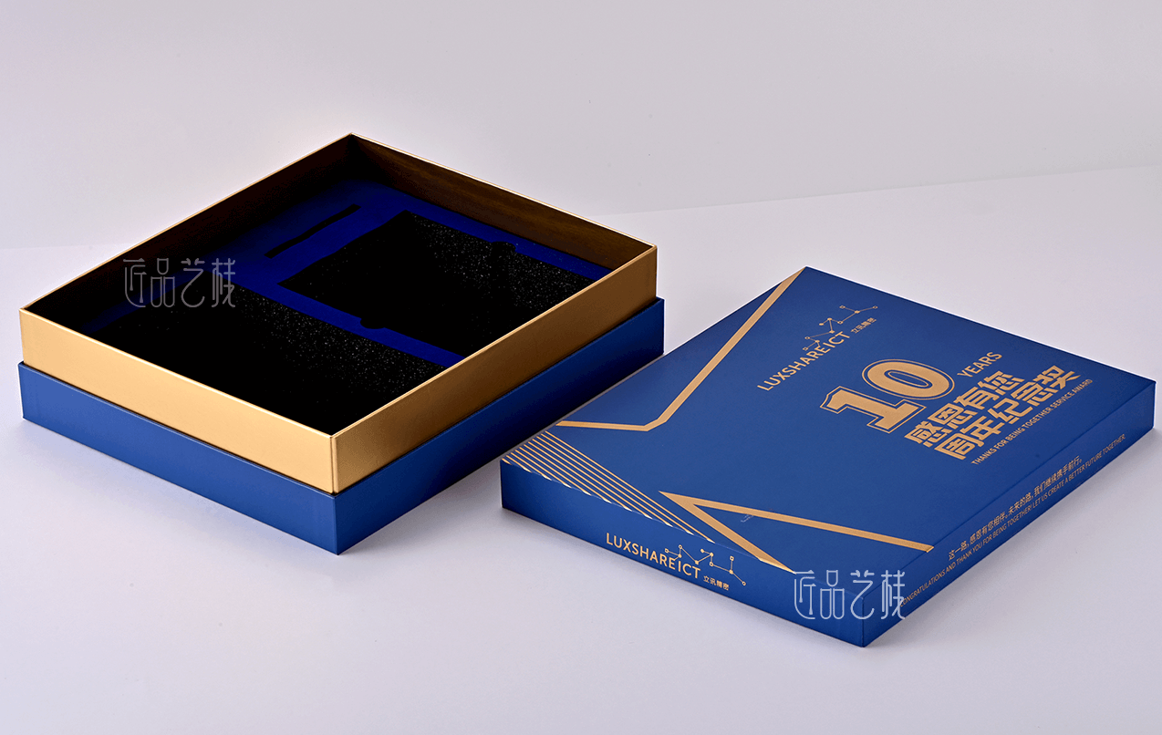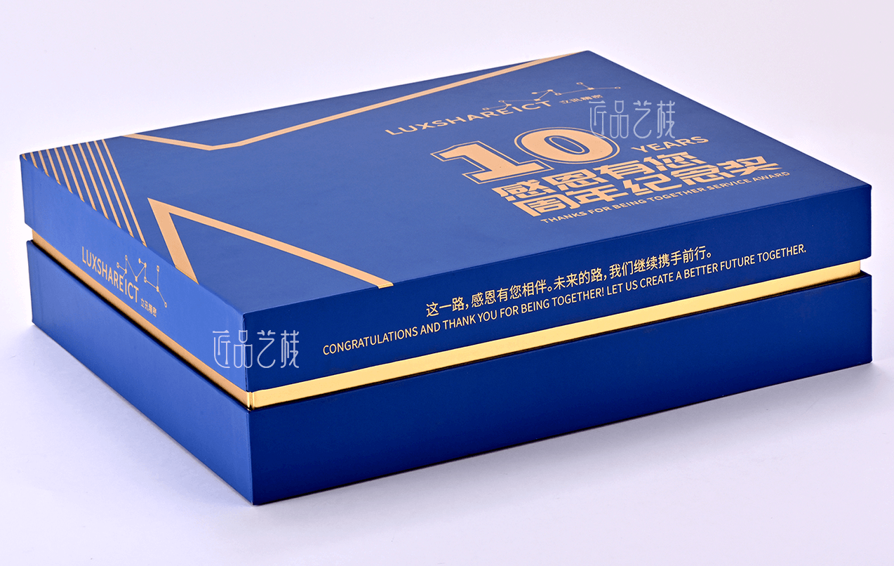 立訊精密是一家專注于連接器的研發、生產和銷售的國家高新技術企業,今已成為中國大陸排名第一、世界排名第八的連接器生產商,本禮盒為其分公司10周年之際,專屬定制的周年紀念禮盒,采用海德堡專色印刷、凸金精燙等工藝,結合金色圍條與天地蓋盒形精裝制作,打造體驗感高檔周年紀念禮盒。